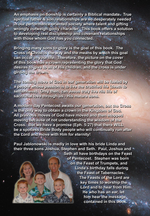 Chapter 1 - My Story - A personal testimony of how God changed my life in college, and what He is doing with me today.Chapter 2 - To Worship God in Spirit and Truth - Answering the age-old question of "who am I?" and how your spirit must be reborn to see the kingdom of God.Chapter 3 - Father Leadership - People need real hands-on father examples and not corporate institutional leadership.Chapter 4 - Spiritual Authority vs. Civil Authority - A teaching to combat the false spiritual authority of the "Nicolaitan doctrine" or the clergy vs. laity system.Chapter 5 - Covenant of Peace: The Millennial Age - A Scriptural study of this biblical Covenant which defines the new age we currently find ourselves transitioning into.Chapter 6 - Finances - As New Covenant believers, how should we give finances to build the Everlasting Kingdom of Jesus on earth?Chapter 7 - Millennial Temple Model - Study and Photos of an actual scale model the author created based on the details given in Ezekiel's vision of a temple which has never yet been built (described in Ezekiel chapters 40-48). |
