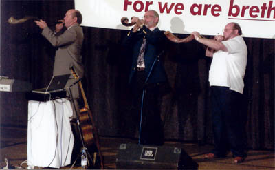 a full color picture of the three shofar horn blowers. "Let the Walls