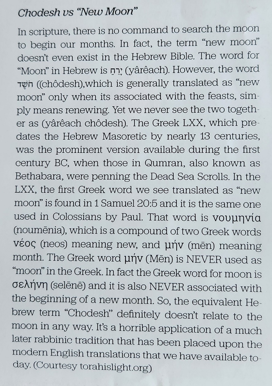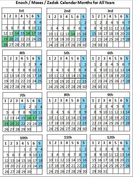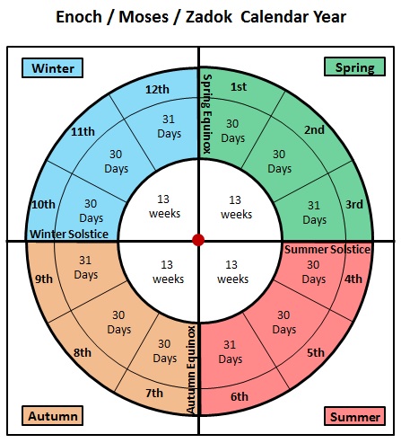 We have been honoring the LORD's New Month celebrations since Pentecost of this year. But by now, at the feast of Tabernacles, it has become apparent that there are many calendars, both secular and Jewish, that claim to be the authority on what day to celebrate the Biblical "new month." While I believe that God uses many calendars, it seems the Enoch/Moses/Zadok calendar is the one used throughout Scripture. The Scriptures must be our source, and the foundation for God's way of keeping time is found in the first chapter of Genesis verse 14 which says: "God said, "Let there be lights in the expanse of the heavens to separate the day from the night. And let them be for signs and for seasons, and for days and years."" This word "seasons" in Hebrew is "moedim" which is more than just spring/summer/autumn/winter. This word means "appointed times" and is also interpreted in the Scriptures as "feasts" because it is an appointed time to meet (feast) with God. They are not the Jewish or Christian feasts, they are the LORD's feasts! In Leviticus 23:2 Yahweh calls them "My feasts." These feasts include the new months, and are appointed seasons (times). Our heavenly Father desires to meet with us in intimacy like a friend or like a bridegroom. He DOES appoint times for us to come and be with Him, and we can either ignore them or ask Him what to do. We can follow the Biblical patterns to know when God is waiting to meet with us. Like any "appointment" on a calendar, we want to be on time, in the right places and at the right dates when God is waiting to show us things about His kingdom on earth. These patterns are extremely regular, and while we can debate the interpretation of what to do on them, the new months as used by Enoch, Moses and Zadok can be determined from the dead sea scrolls which were discovered in 1948.(1) The modern Jewish/Hebrew calendar currently sets their months based on calculations from Rabbi Hillel who lived around 350 AD. The problem is that they are calculated based on the "new moon." In other words, their months start when the moon starts a new cylce of light. But the Biblical New Month, as used by Enoch/Moses/Zadok, is determined by the sun and not the moon. This is how the patriarchs always calculated a "new month." The "new moon" came out of Babylon and not from Scripture. The Hebrew words in the Scripture for "new" and "moon" are NEVER together, therefore, "new moon" is not Scriptural. Yareach (yod, resh, chet) is the Hebrew word for "moon." And Chodesh (chet, shin dalet) is the Hebrew word often interpreted as "new moon" but it simply means "new" or "renewing." Only when this word Chodesh is associated with the feasts is it sadly misinterpreted as "new moon," but moon is not in the word at all. The "Enoch/Moses/Zadok Calendar Year" chart here shows the basics of the Calendar created most likely by Enoch, used by Moses and found in the dead sea scrolls. It is now known more widely as the "Zadok calendar" because the high priest Zadok used it too. As you can see, the calendar has 4 seasons based around the sun with 13 weeks per season that includes an extra day at the end of each season to make 364 total days per year. There may be up to an extra week before the first day of each year, because it ALWAYS falls on the first Wednesday after the Spring Equinox.(2) Therefore there may be a few extra days between the last day of winter and the first day of the new year, but it will always be less than a week. This calendar has the same days of the month ALWAYS falling on the same day of the week every year, so there is great consistency with God's feast days always falling on the same day of the week every year. This allows ALL of the feast days (or high sabbaths such as Passover, Pentecost and Tabernacles) to have their own celebration day outside of the regular weekly Sabbath day. This is not the case with the Jewish Hillel calendar, because it is constantly changing the days of the week every year such that many of the High Sabbaths fall on regular weekly Sabbaths too. The second chart below shows the months and dates of this Enoch/Moses/Zadok Calendar which are the same EVERY year.