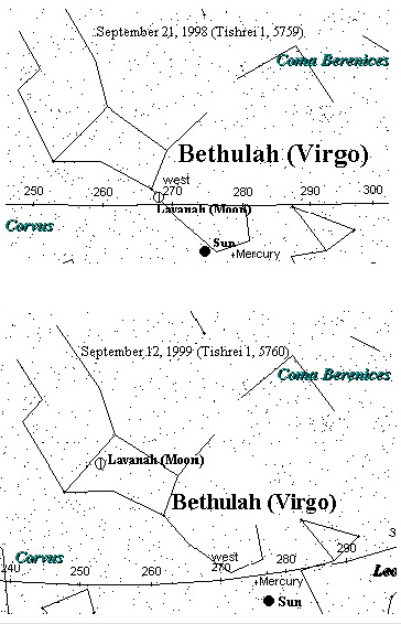 When I first saw the above picture, I immediately thought of the Revelation 12 sign. This celestial picture is for Yom Teruah, The Feast of Trumpets in 1999, which is 5760 on the Biblical anno mundo scale. This sign occurs on Shabbat, the Sabbath (Friday sundown to Saturday sundown). The above picture does not show Draco, the Dragon, because it would make the picture curved and hard to relate to. If you had a larger picture you would see that Draco is poised above the woman, waiting to snatch the man-child. The moon is poised in the "birth canal" of the young woman who is lying down with her feet in the air. The word "Bethulah" is in the location where her head should be. The constellation of Coma Bernice is the crown of twelve stars above the young woman's head.